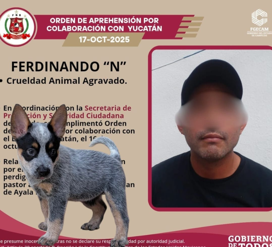 Agentes de la Secretaría de Seguridad Pública (SSP) y de la Fiscalía General del Estado (FGE), confirmaeon que en colaboración con sus homólogos del estado de Campeche, detuvieron a Ferdinando “N.”, de 38 años, acusado del delito de crueldad animal agravada en contra de Sicilia, una perrita pastor ganadero australiano que fue herida con perdigones.