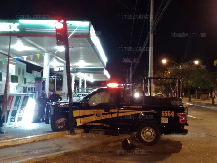 Por el impacto, la unidad policiaca terminó encima de la banqueta derribando un poste de la gasolinera que impidió se fuera contra las bombas de combustible y siguiera causando destrozos.