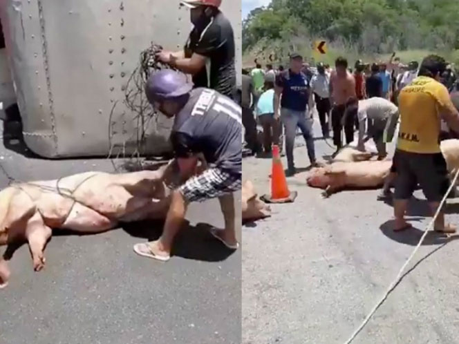 Lugareños al percatarse de la volcadura, dieron la voz de alerta, pero no para ayudar al conductor, el objetivo fue la carga: cerdos; unas 20 toneladas en peso bruto.