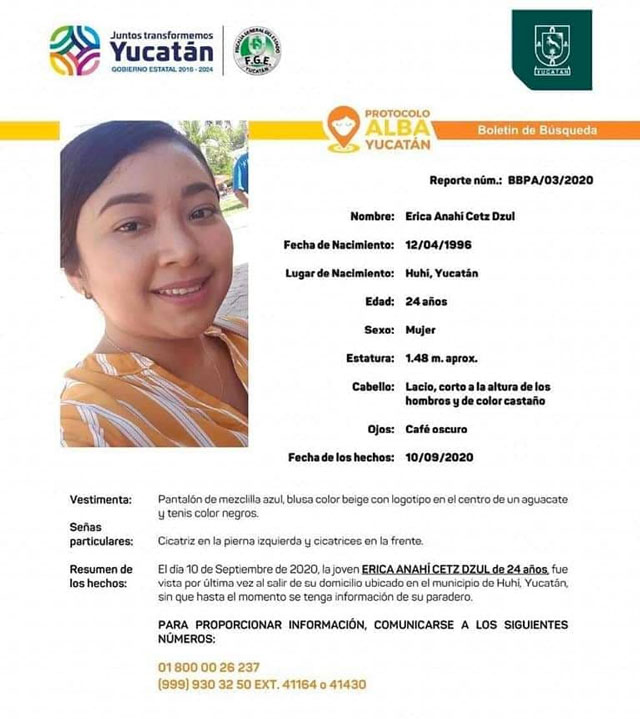El cadáver de Erika, quien desapareció desde el 10 de septiembre pasado, fue localizado en una fosa en un terreno cercano a la carretera Huhí-Sotuta, todo indica que se trató de un caso de feminicidio, con este serían siete en lo que va del 2020.