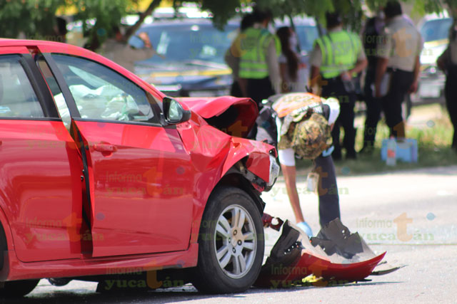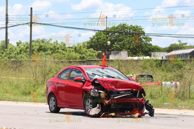 Los hechos ocurrieron en el kilómetro 45 de periférico de Mérida, muy cerca del Complejo de Seguridad, cuando un vehículo Tsuru blanco, intentó incorporarse a la vialidad que va de poniente a sur e invadió el carril de circulación por lo que fue brutalmente impactado por un vehículo Sonic que transitaba hacia el sur.