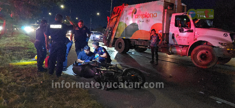 Mérida, Yucatán a 18 de agosto de 2025 (InformaTe Yucatán).- Un motociclista estuvo a punto de ser aplastado entre un camión recolector de basura y una camioneta Honda, tras un aparatoso choque ocurrido en el Periférico de Mérida, a unos metros del puente de Ciudad Caucel.