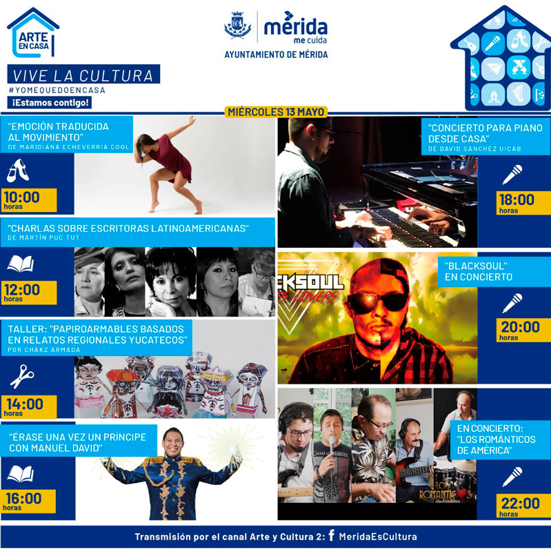 Las transmisiones se pueden seguir toda la semana en los canales de Arte y Cultura 1 (Youtube Mérida es Cultura) y 2 (Facebook MéridaesCultura), de 10 de la mañana a 22:00 horas. Los contenidos son aptos para toda la familia y permanecen en la red para que los seguidores puedan volver a revivir las obras que van desde teatro, comedia regional, tributos musicales, charlas, poesía y talleres para poner en práctica la creatividad aprovechando estos tiempos de confinamiento social en casa.