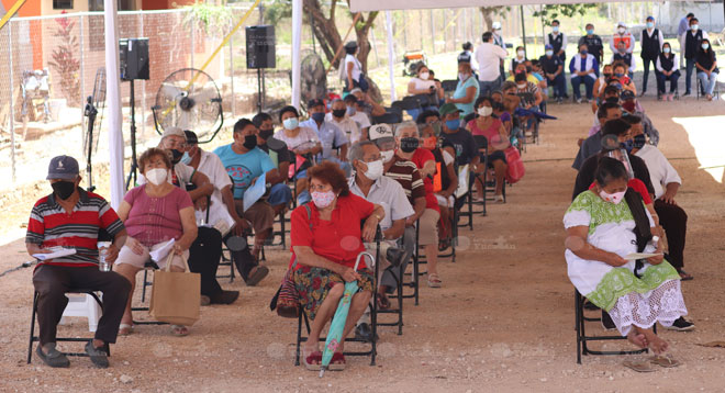 Abuelitos de Umán esperan su turno para ser inmunizados contra el virus sars cov2.
