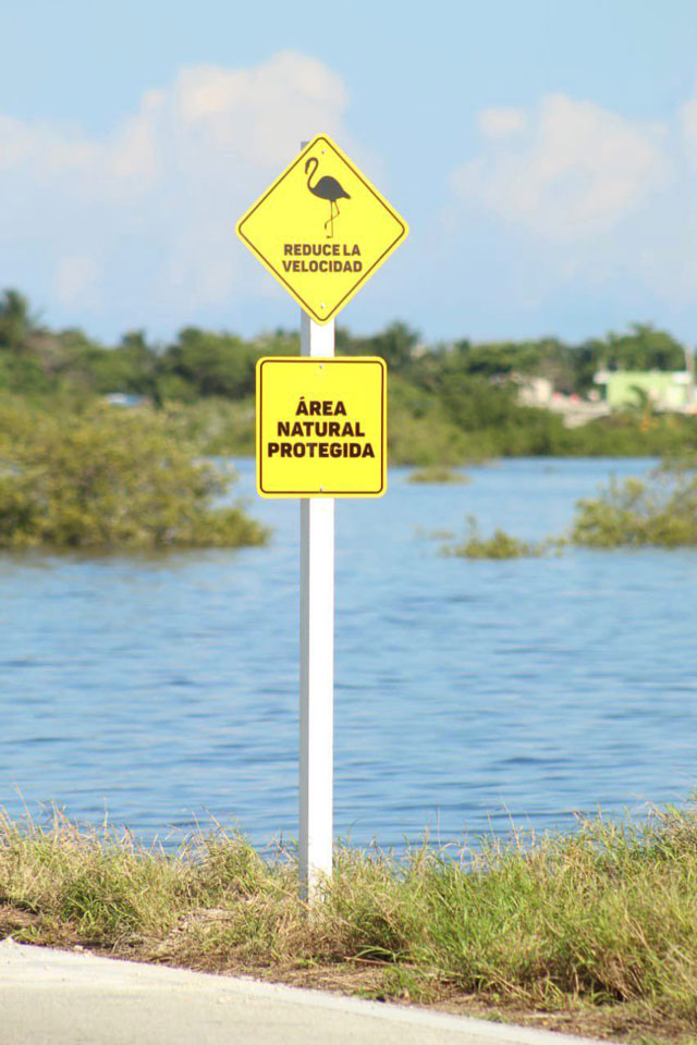Mérida Yucatán a 15 de octubre de 2020.- Para proteger a los flamencos que vieron afectado su hábitat debido a las inundaciones que dejaron los fenómenos naturales “Gamma” y “Delta”, el Gobierno del Estado colocó una serie de señalamientos en los puntos donde se han refugiado estos ejemplares y por donde se desplazan de manera natural.