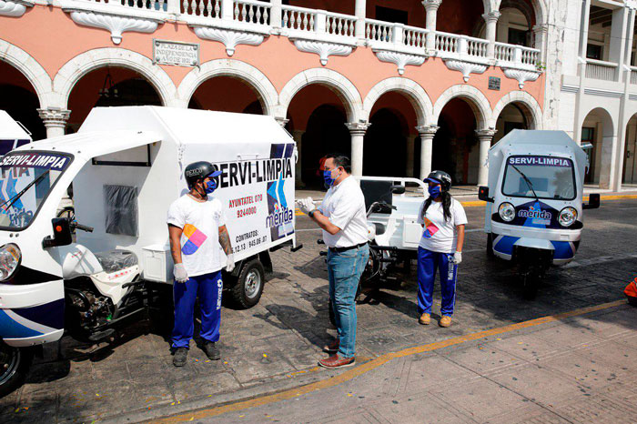 Mérida, 15 de abril de 2020. La recolección de basura es un servicio fundamental y delicado que no puede dejarse de prestar ante ninguna circunstancia y, por el contrario, en esta contingencia sanitaria por el Covid-19 es necesario reforzarlo para seguridad de usuarios y recolectores, aseguró el alcalde Renán Barrera Concha al poner en operación 4 nuevos vehículos motorizados de la empresa Servilimpia destinados al Centro Histórico.