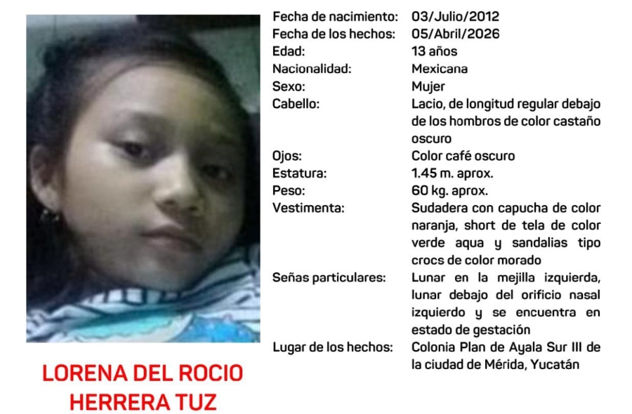 La Fiscalía General del Estado activó una Alerta Amber en Yucatán para localizar a Lorena del Rocío Herrera Tuz, adolescente de 13 años reportada como desaparecida en la colonia Plan de Ayala Sur III.