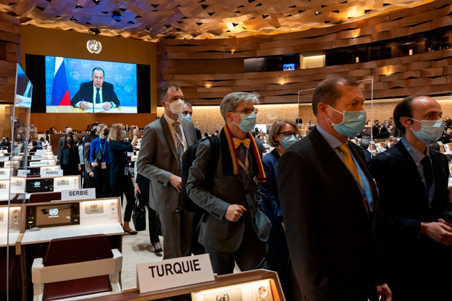 Delegados abandonan la sala mientras habla por vía remota el ministro de Asuntos Exteriores de Rusia, Serguei Lavrov (en la pantalla), en el Consejo de Derechos Humanos de la ONU en Ginebra, el 1 de marzo de 2022. Foto AFP