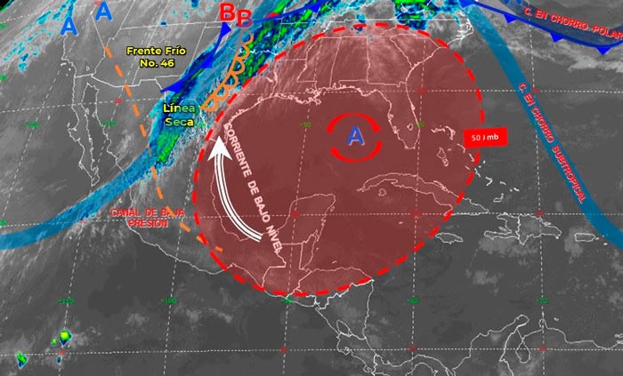 Se mantendrán condiciones de tiempo estables, con cielo despejado en gran parte de la península de Yucatán, asociados al sistema anticiclónico, no se prevén lluvias. Las temperaturas seguirán siendo calurosas a muy calurosas y viento dominante del este-sureste cambiando por la tarde al noreste de 15 a 25 km/h con rachas de 50 km/h en la costa de Yucatán y sobre la sonda de Campeche.