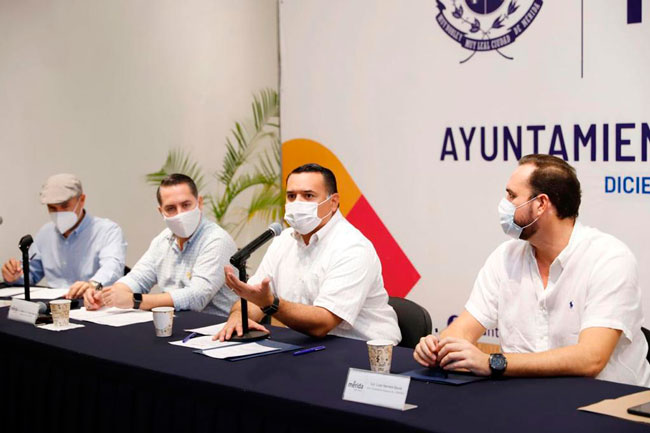 Mérida, 20 de diciembre de 2020. El Ayuntamiento trabaja de la mano y mantiene un diálogo abierto permanente con la sociedad civil organizada, cámaras y empresarios a fin de generar las mejores condiciones para continuar la reactivación económica y encontrar las estrategias adecuadas para favorecer a todas las partes involucradas, aseguró el alcalde Renán Barrera Concha.