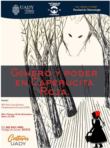 La charla didáctica “Género y poder en Caperucita Roja” se llevará a cabo este viernes 10 de diciembre a las 12:00 horas a través de Zoom, por lo que el enlace y código de la reunión se puede consultar en la página de Facebook Cultura UADY.