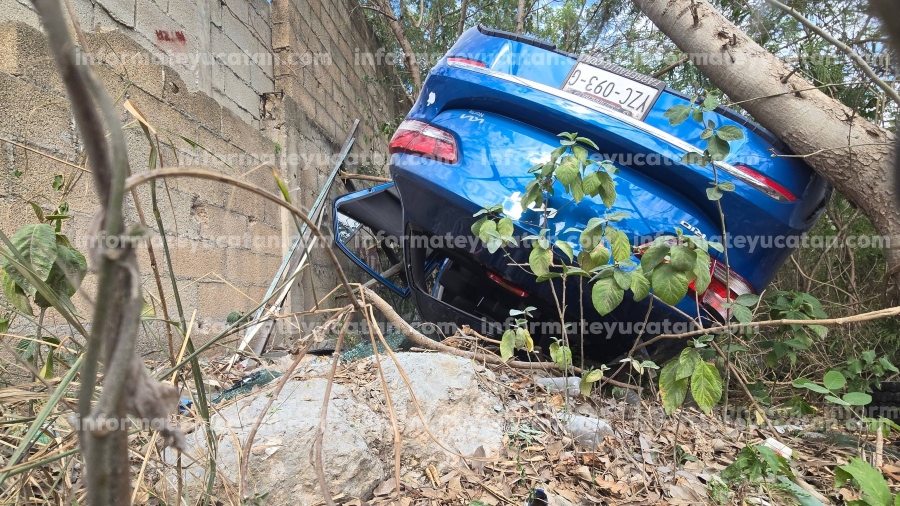 Una aparatosa volcadura sorprendió a conductores en el kilómetro 47 del Periférico de Mérida, donde un automóvil terminó con las llantas hacia arriba dentro de un terreno baldío.