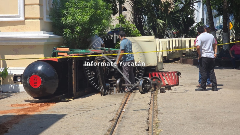 A través de un comunicado de prensa, el Ayuntamiento de Mérida informó que la volcadura de una locomotora del trenecito ocurrió luego del desprendimiento de la pieza delantera conocida como “quita piedras”.