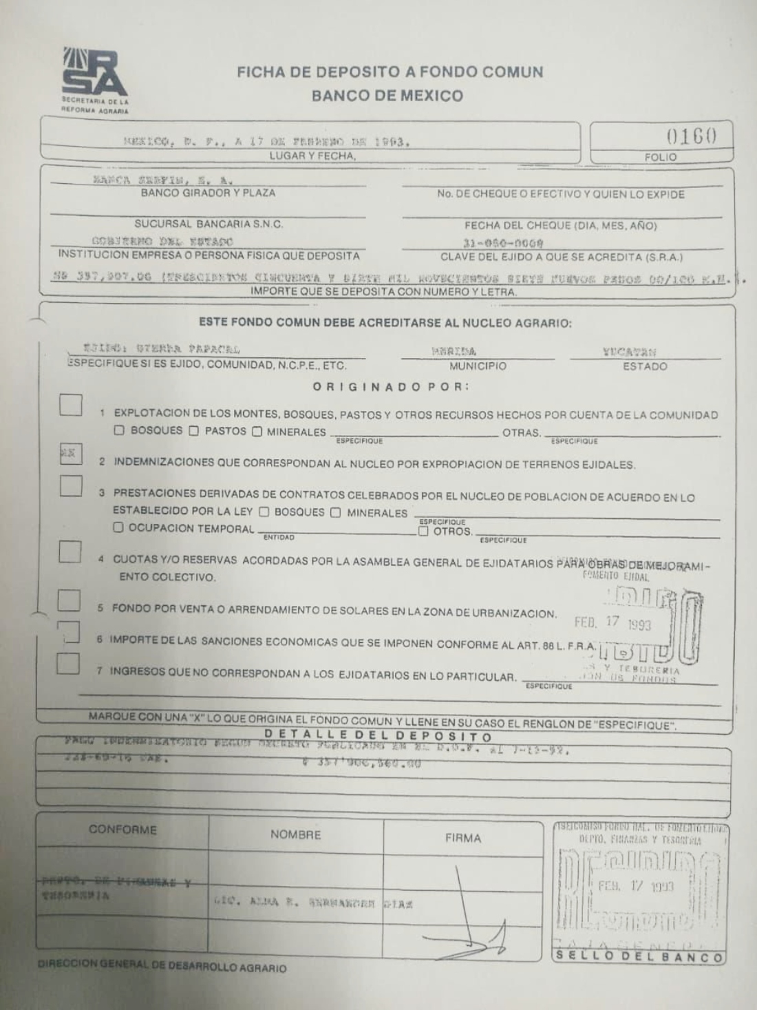 El pago, determinado por la Comisión de Avalúos de Bienes Nacionales, ascendió a más de 357 millones de pesos y fue entregado a los ejidatarios a través del Fifonafe, según consta en documentación oficial.